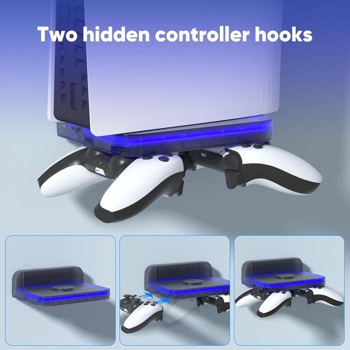 Desain wall mount ini dilengkapi dengan dua slot untuk kontroler. Anda dapat meletakkan kontroler PS5 di dinding untuk akses yang mudah dan menghemat ruang pada pusat hiburan Anda. Lampu RGB menambah nuansa dan atmosfer permainan yang sedang Anda mainkan.